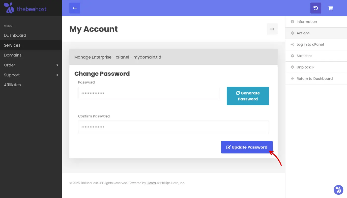 Next, enter your new password in both fields and click the Update Password button to save the changes.